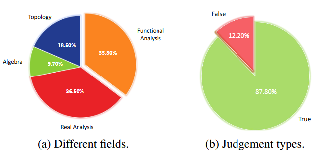 陈述-理由对(statement-rationale)的分布情况如图4a所示。此外,我们统计了判断的分布情况,在图4b中给出。我们观察到,大多数语句都被标注为True。这可能是因为数据来源于数学教材,其中大多数语句用语正确,以避免误导读者,特别是数学新手。一般来说,这些陈述往往涉及几个大学级别的数学概念或性质,侧重于对数学的细致入微的理解。在实际应用中,由于表述简洁,这些陈述经常被用作与数学相关的研究生课程中的面试问题。