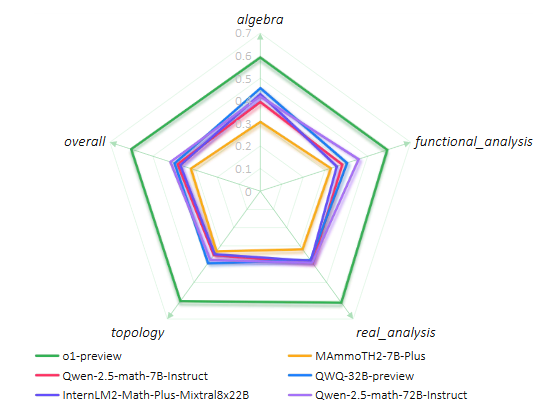 团队进一步对COUNTERMATH中四个不同的领域进行了细粒度的分析,挑选了不同参数大小的6个不同模型,具体结果如图6所示。我们注意到,从模型性能来说,o1在每个领域均大幅领先其余模型,而每个领域展现出的性能较为平均。其余的开源模型中,我们注意到在代数和泛函分析的性能普遍更优,而在拓扑和实分析的性能更差。这说明:大模型在高等数学的 "冷门领域" 存在严重知识缺口。