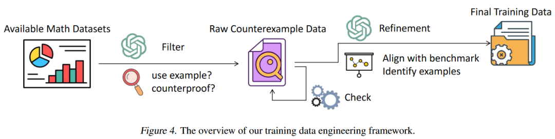 团队提出了一个自动训练数据工程框架来获取训练数据。由于目前大多数LLMs无法提供令人满意的基于实例的数学证明,因此在数据收集时,我们从现有的人工编写的数据集中筛选数据,而不是直接生成反例数据。我们收集一系列已经经过严格标注与数据过滤的数学证明数据集,包括proofnet,naturalproof等数据,利用GPT-4o筛选出其中的使用了反例进行证明的数据。我们编写一系列数据筛选的准则,评判数据中是否采用了反证法进行证明,使用了反例进行说明,或举出特殊的例子。最终,我们从超过30K的数据中,筛选出1,025条数据。