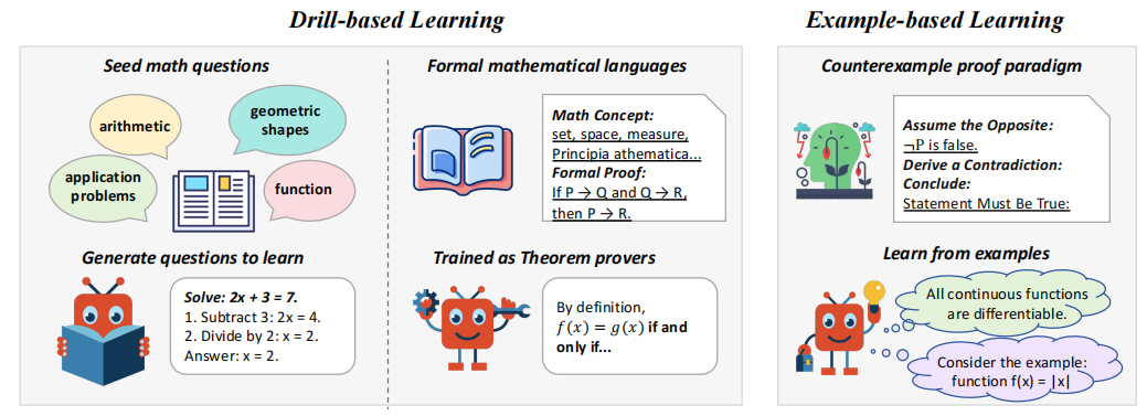 传统数学证明训练往往遵循让模型进行大量"刷题式"演练的范式:如图1所示,通过综合设计各种类型的题目,或者训练模型学习形式化的数学证明语言。然而,模型在遇到复杂数学概念时容易陷入"熟悉式"学习,仅仅只是记住了这些概念,而缺乏深层次的理解,因而难以在测试中灵活运用这些数学概念。