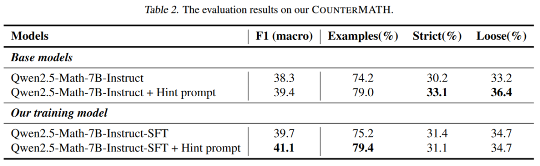 分布外(OOD)基准上的评测结果。我们进一步在OOD的基准上进行评估,希望证明我们训练后的模型,不仅在专有的反例数学概念推理基准COUNTERMATH上有较好的能力,还可以将这种举反例的能力迁移到其他数学能力基准测试中,有着更为通用的性能提升。为了公平对比,我们使用了同样的prompt与设置,对基础模型和训练后的模型进行了评估。我们发现训练后的模型在两个被广泛使用的基准测试数据中均超过了基础模型,尤其是展现了比参数量更大的72B模型更优的性能。这很好地符合了我们的假设,当模型学会这种额外的使用例子进行推理的能力时,可以增强整个数学领域的概念推理能力。