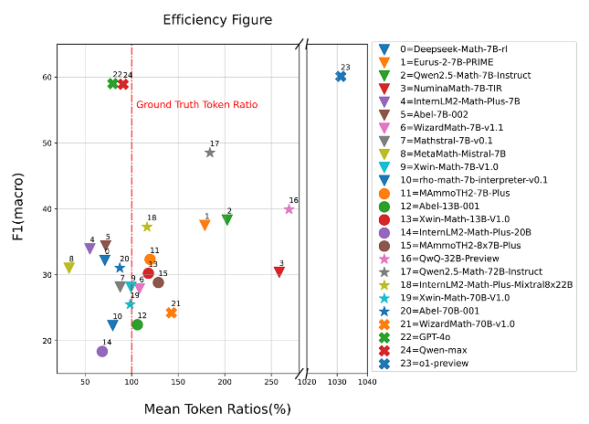 模型性能和token使用效率之间的关系是理解模型设计中trade-offs的关键因素。如图7所示,我们分析了平均token比率( % ,由模型在推理过程中实际使用的令牌数除以基本真值答案中的令牌数计算得到),代表token使用相对于真实值的效率,与反映模型预测性能的F1分数之间的关系。o1-preview 和QwQ-32B-Preview 等推理模型在推理过程中使用了大量的token,但并没有导致F1分数的相应提高。这表明基准任务是非常困难的,简单地增加令牌推理的长度或细节并不一定能提高性能。Qwenmax 和GPT-4o等模型显示了令牌使用和性能之间很好的平衡。这些模型在保持令牌消耗接近真实令牌比例的同时,获得了相对较高的F1分数。这表明他们能够高效地执行精确推理,而不过度依赖额外的令牌使用。
